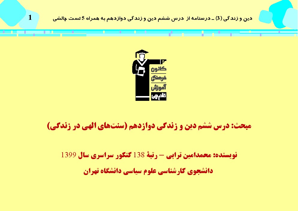 این مطلب شامل درسنامه با 5 تست چالشی از کتاب سه سطحی دینی (3)، درس ششم دین و زندگی دوازدهم (سنتهای الهی در زندگی) میباشد.