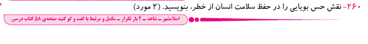 نقش حس بویایی در حفاظت از انسان: ما با حس کردن بوی بسیاری از مواد متوجّه خطر آنها میشویم و خودمان را از آن مواد دور میکنیم مثلاً وقتی بوی گاز به مشام ما میرسد، متوجه میشویم احتمال خطر انفجار و یا گازگرفتگی وجود دارد.