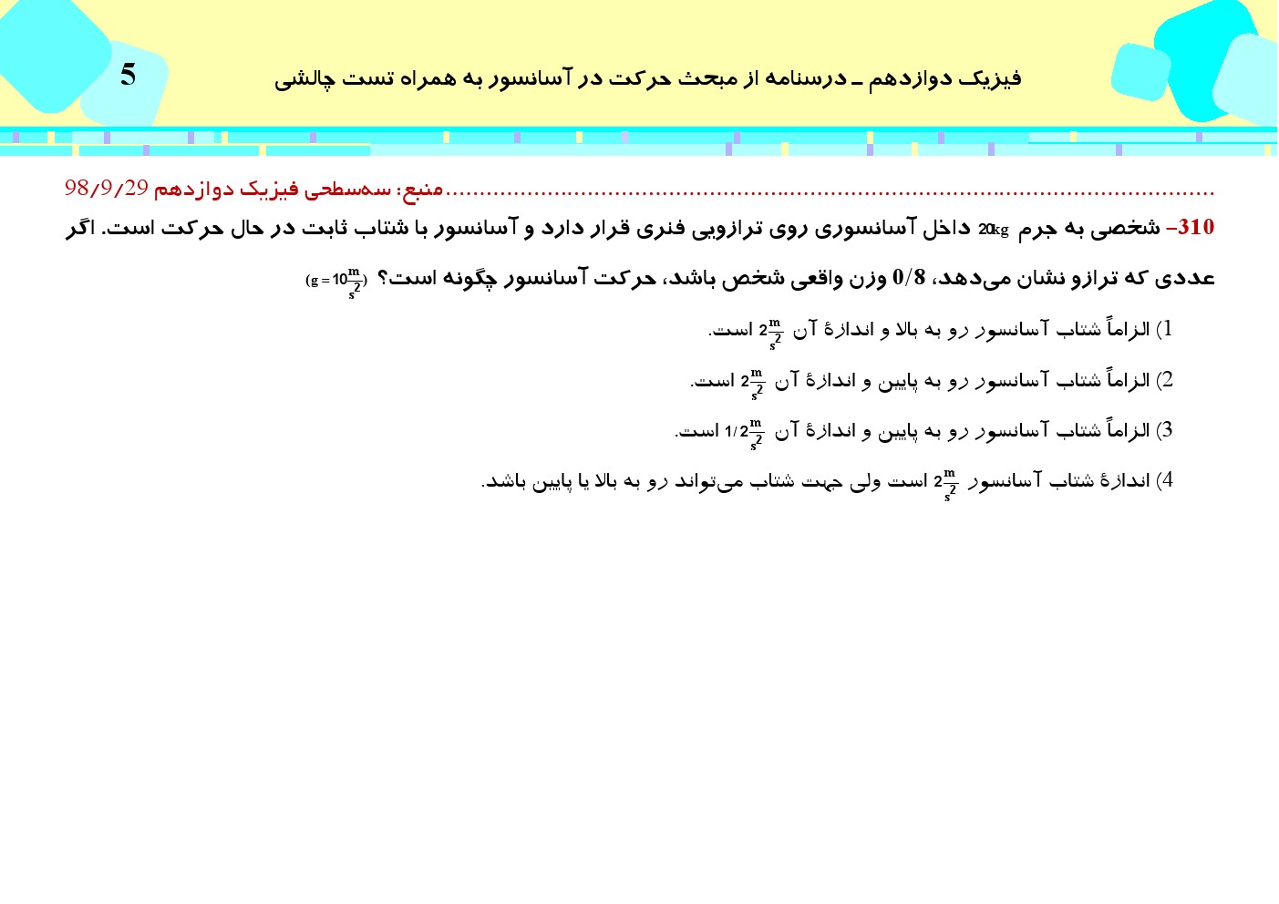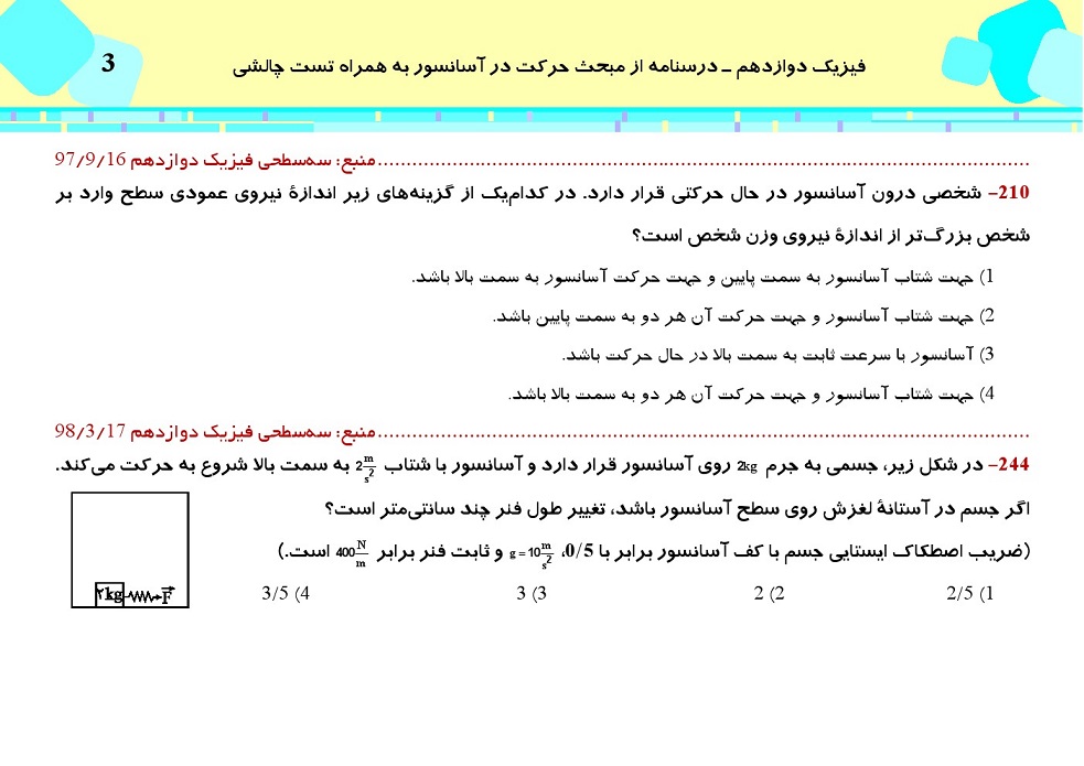 این مطلب شامل درسنامه با 5 تست چالشی از کتاب سه سطحی فیزیک (3)، مبحث حرکت در آسانسور میباشد.