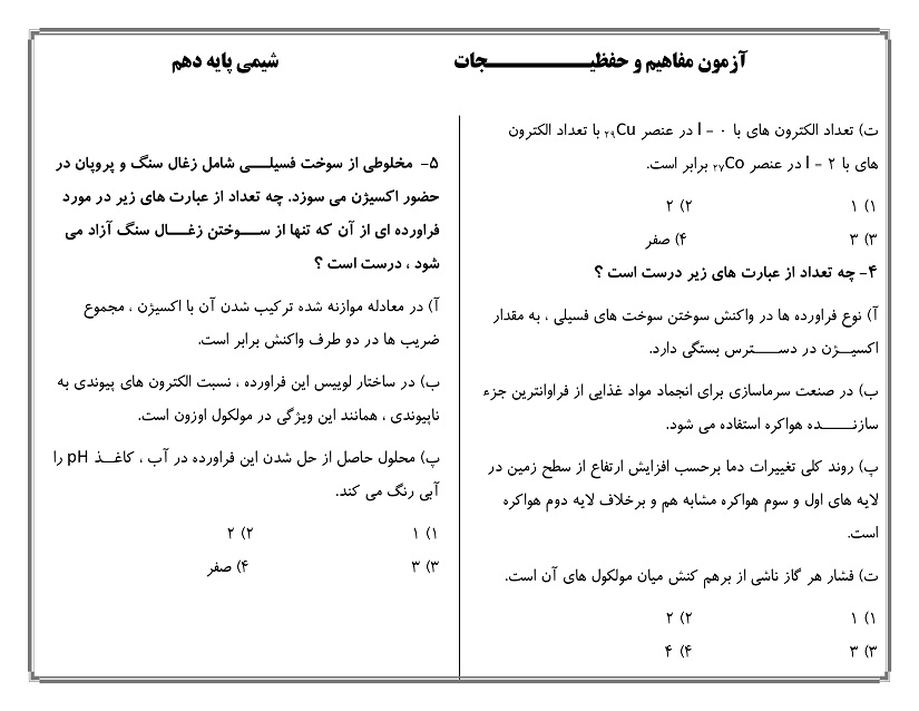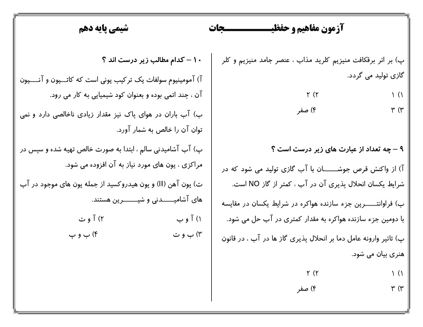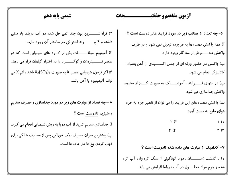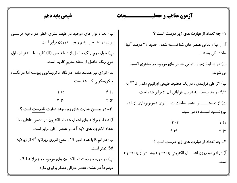 سلام به دهمیهای عزیزبا پاسخگویی به نمونه سؤالات زیر، دانش حفظیات خود را در درس شیمی دهم بسنجید.برای مطالعه پاسخ، فایل pdf قرار داده شده را دانلود کنید.