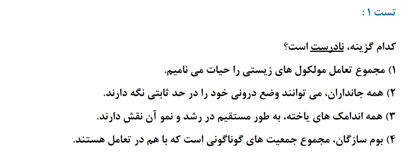 این مطلب شامل 15 تست مهم و چالشی به همراه پاسخ تشریحی، جهت جمع بندی زیست شناسی پایه دهم می باشد. * گروه پشتیبانان ویژه کانون *جهت مشاهده فایل سوالات به همراه پاسخنامه، به بخش ضمیمه مراجعه نمایید.