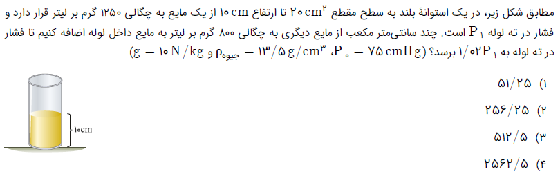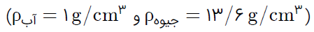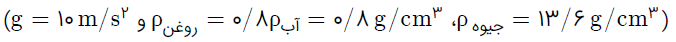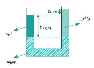 در شکل زیر، دو سطح جیوه در یک تراز قرار دارد و سیستم به حالت تعادل است.تقریبا چند سانتی متر به ارتفاع ستون آب اضافه کنیم، تا سطح آزاد آب و روغن در یک تراز قرار گیرند؟