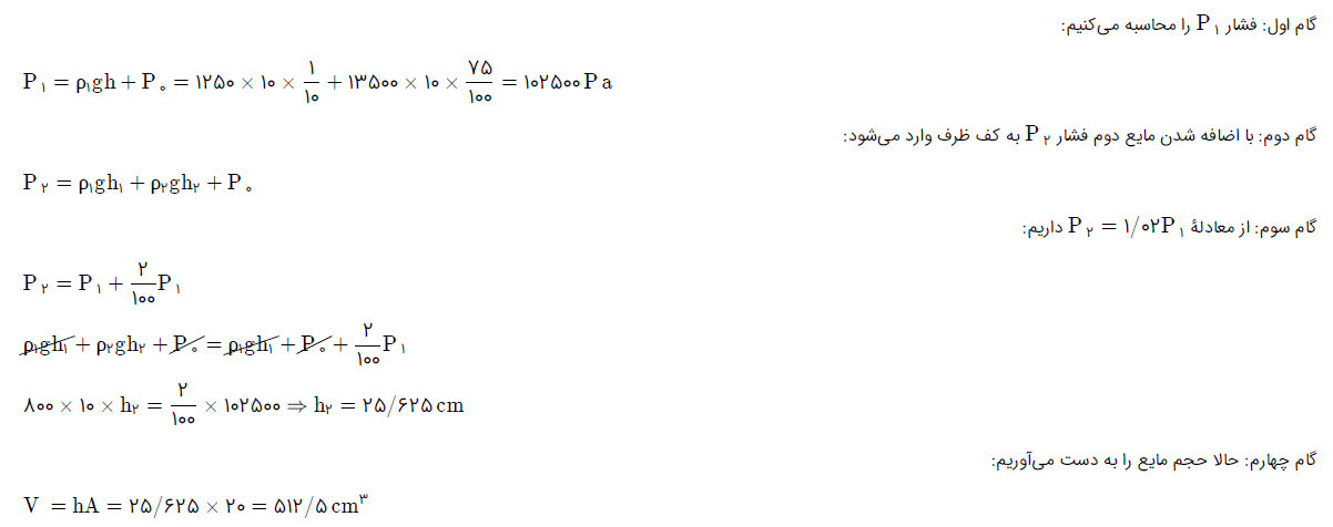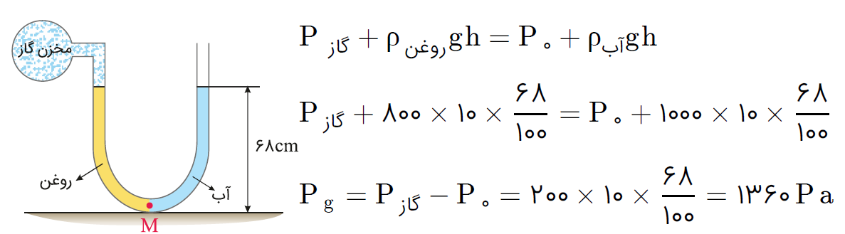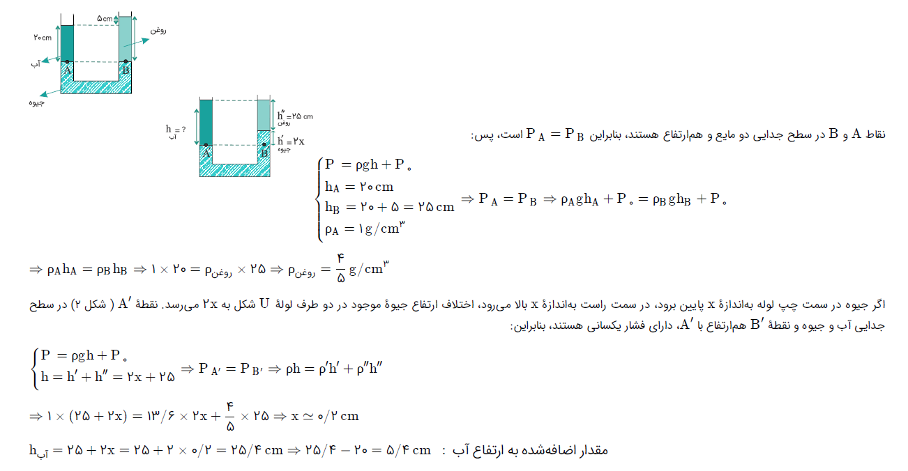 گام اول: در مرز مشترک آب و روغن با هم برابر است. با توجه به برابری فشار در دو طرف لوله، رابطه ی تساوی فشار را می نویسیم: