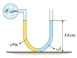 مطابق شکل زیر، درون لوله ی یو شکلی که به یک مخزن گاز متصل است، حجم مساوی از آب و روغن قرار دارد. فشار پیمانه ای مخزن گاز چند میلی متر جیوه است؟
