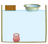 در شکل زیر، یک ظرف خالی و یک قطعه چوب روی آب شناور اند و یک وزنه ی فلزی در کف ظرف آب قرار دارد. اگر چوب را از سطح آب برداشته و داخل ظرف قرار دهیم، فشار در کف ظرف آب چگونه تغییر می کند و اگر وزنه را از جایی که قرار دارد، برداریم و درون ظرف قرار دهیم و ظرف همچنان شناور بماند، فشار در کف ظرف آب چگونه تغییر می کند؟ (به ترتیب از راست به چپ)