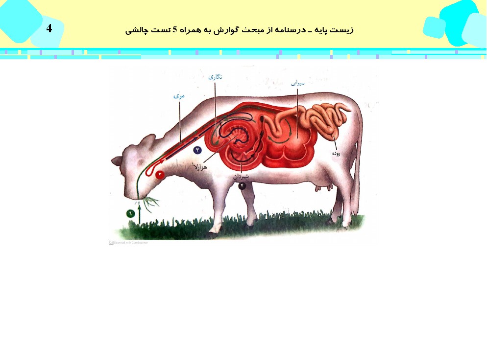 نکته: در معده چهارقسمتی گاو ترشح آنزیمهای گوارشی در دو محل سیرابی و شیردان مشاهده میشود ولی دقت کنید که ترشح آنزیمها از یاختههای بدن گاو فقط در شیردان صورت میگیرد (آنزیمهای موجود در سیرابی از باکتریها ترشح میشوند.)