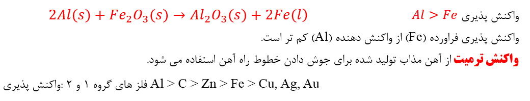 در هر واکنش شیمیایی که به طور طبیعی انجام می شود، واکنش پذیری فراورده ها از واکنش دهنده ها کمتر است؛ پس اگر یک واکنش به ما بدهند که در دو طرفش به عنصر آزاد وجود داشته باشد و بگن که این واکنش به طور طبیعی انجام میشه، ما خیلی سریع می تونیم واکنش پذیری دو عنصر آزاد در دو طرف معادله را با هم مقایسه کنیم: