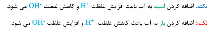 نکته: ثابت تعادل یونش آب فقط به دما بستگی دارد و با اضافه کردن اسید یا باز تغییر نمی کند.