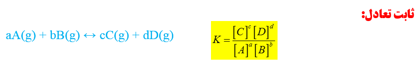 نکته: تنها عامل موثر بر ثابت تعادل فقط دماست و با تغییر غلظت،تغییر فشار، تغییر حجم ظرف واکنش و یا به کار بردن کاتالیزگر، مقدار ثابت تعادل (K) تغییر نمی کند.