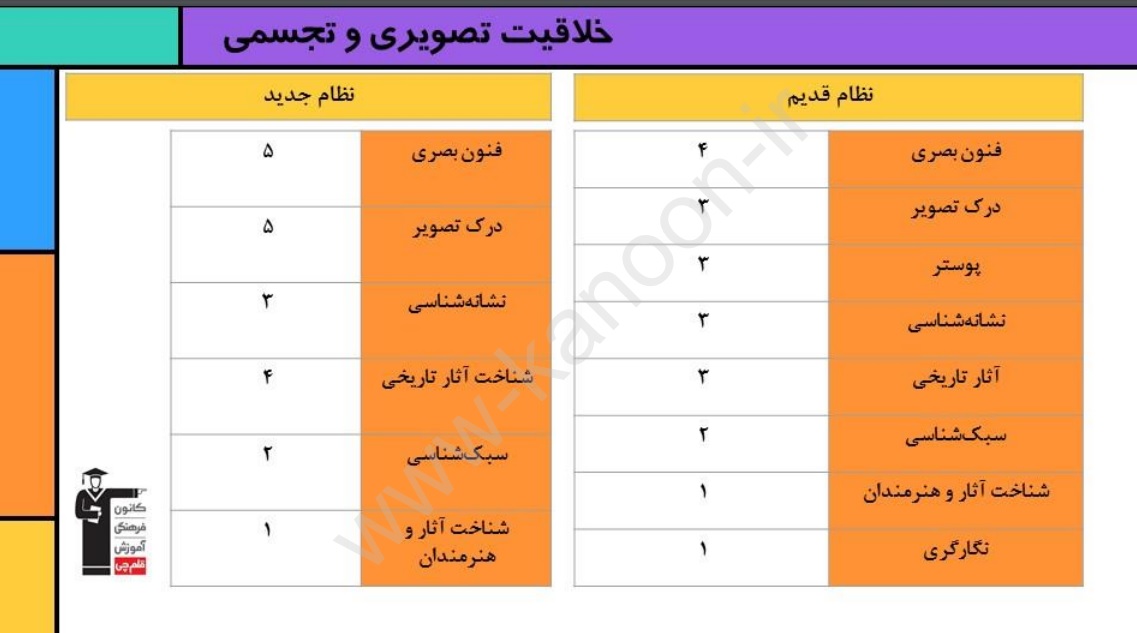 1 سوال از کتاب نقوش سنتی و 1 سوال مربوط به هنر نگارگری تقریبا در کتاب مکاتب نقاشی در آزمون نظام قدیم مطرح شد.