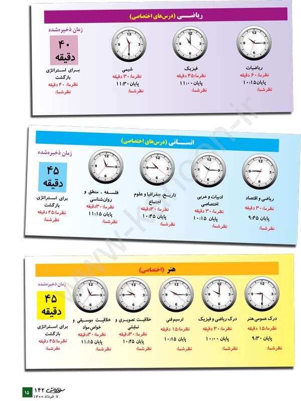 زمانهای پایانی را برای هر درس در بالای صفحهی آزمون بنویسید.