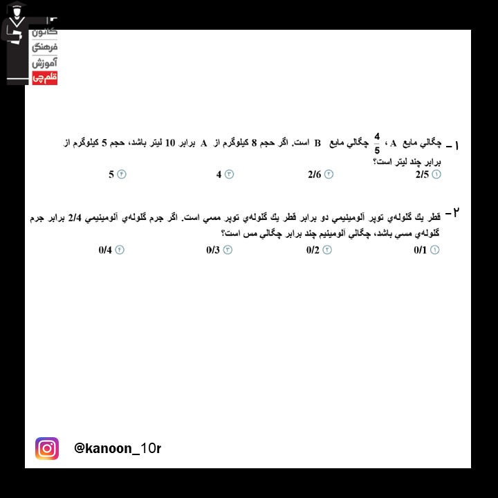 در این آزمونک 5 سوال فیزیک دهم(به همراه پاسخ) از مبحث چگالی، توسط فاطمه احدزاده رتبه 373 ریاضی سال 95 برای شما آورده شدهاست.
