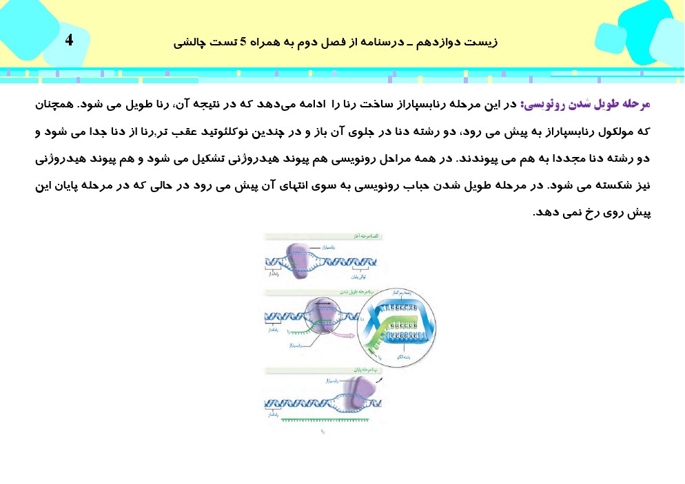 4) همانند مرحلة آغاز، پیوندهای هیدروژنی میان دو رشتة مولکول دنا، توسط آنزیم رنابسپاراز شکسته میشود.