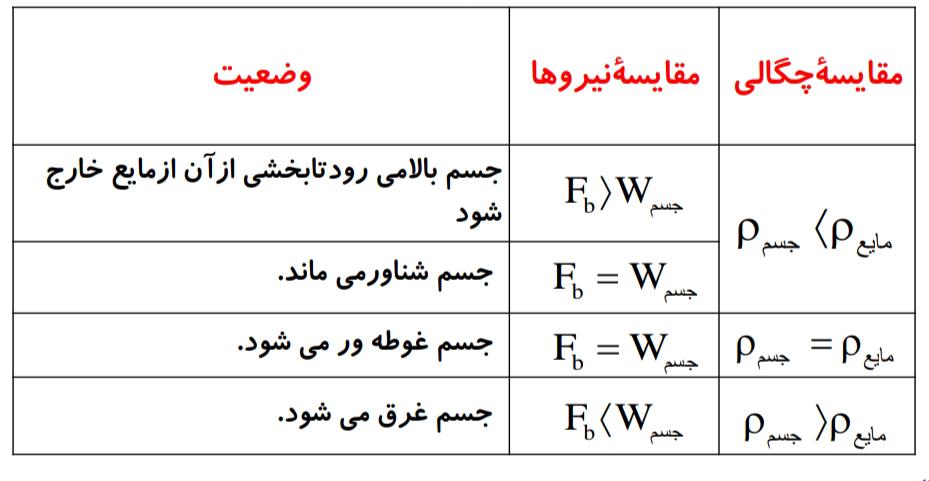 مقایسه نیروی شناوری و وزن جسم در حالات مختلف