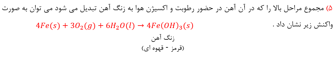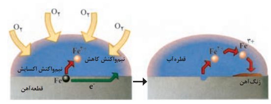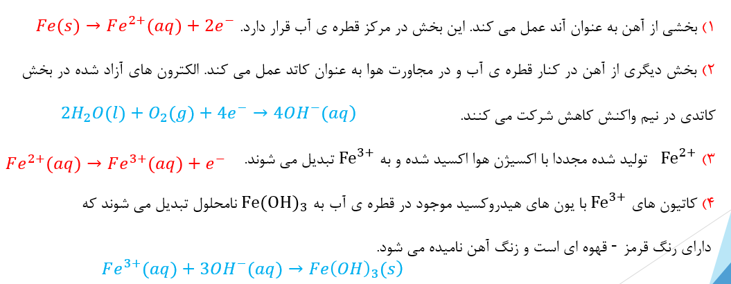 شکل زیر مراحل زنگ زدن آهن در حضور رطوبت و اکسیژن را نشان می دهد.