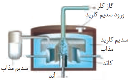 در صنعت فلز سدیم را از برقکافت سدیم کلرید مذاب دریک سلول الکترولیتی به نام سلول دانز که به شکل زیر است، تهیه می کنند.
