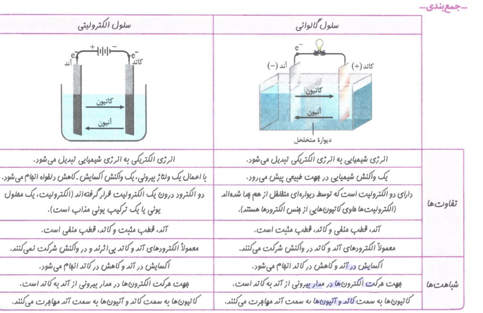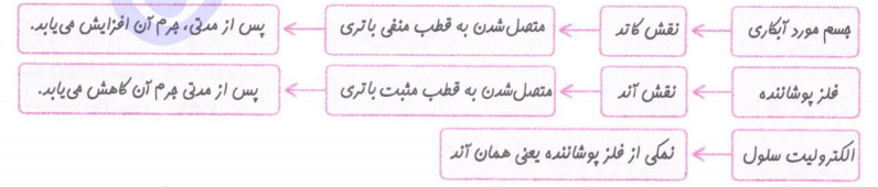 7-قطب مثبت باتری به آند و قطب منفی به کاتد متصل است. (در سلول گالوانی، کاتد بهقطب مثبت و آند به قطب منفی متصل است.)