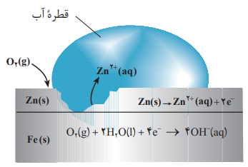 آهن در نقش کاتد حفاظت می شود و روی در نقش آند از بین می رود.