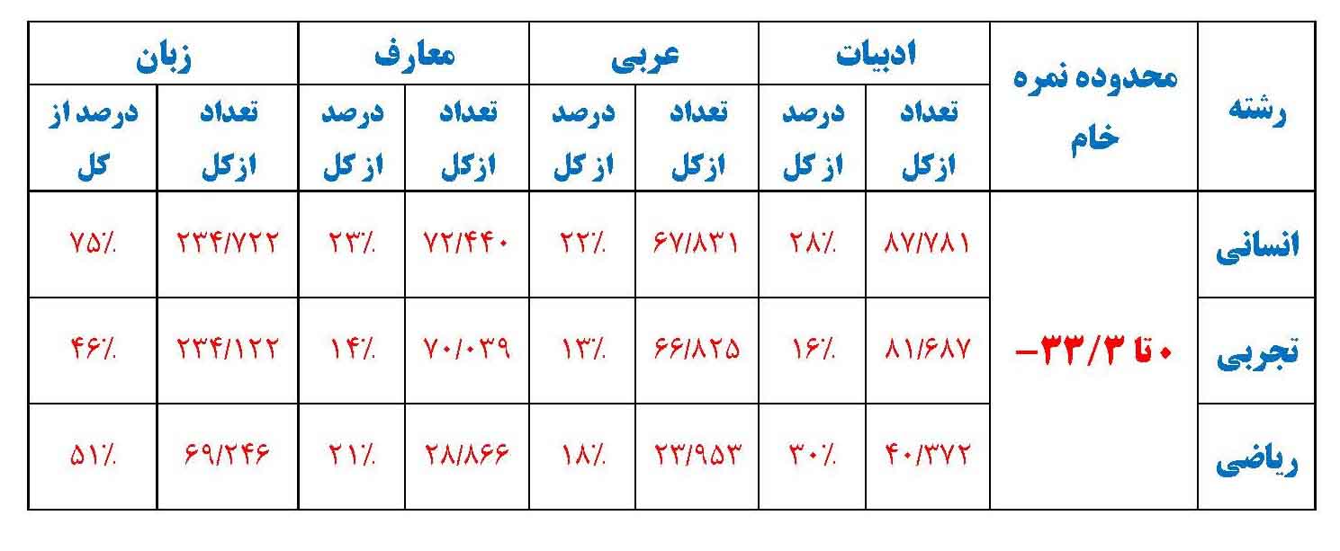 در کنکور سال 1399 در رشته انسانی 314 هزارو 459 نفر ، در رشته تجربی 506 هزار و 729 نفر و در رشته ریاضی 135 هزار و 363 نفر حضور داشتند که نتیجه پاسخگویی آنها در دروس عمومی به شرح زیر بوده است: