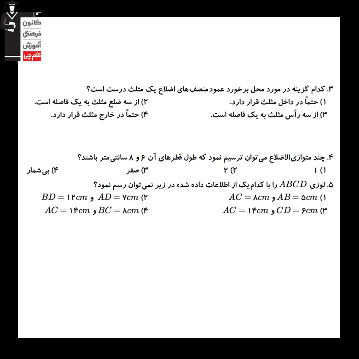 برای حل سوالات بیشتر، حتما تستهای کتاب آبی و سه سطحی هندسه دهم را تمرین کنید.