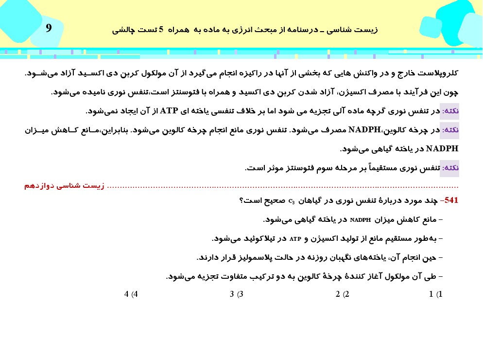 ۷- واکنشهای کالوین مستقل از نور انجام میشوند اما به دلیل وابستگی این واکنشها به ATP وNADPH ، به طور غیر مستقیم به نور وابستهاند.
