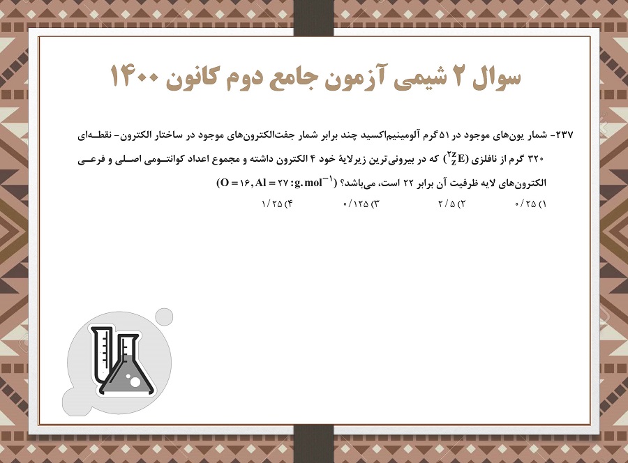 سوال دوم شیمی آزمون جامع کانون را مطالعه و سعی کنید آن را حل کنید. سپس فیلم حل این سوال توسط آقای سروش عبادی را مشاهده کنید.