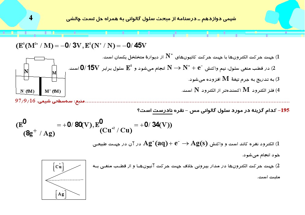 این مطلب شامل درسنامه با 5 تست چالشی از کتاب سه سطحی شیمی دوازدهم ، مبحث سلول گالوانی میباشد.در قسمت ضمیمه فایل درسنامه به همراه پاسخ تشریحی سوالات قرار داده شده است.این مطلب توسط سارینا زارع تهیه شده است.* گروه برترهای کانون *