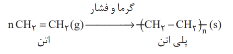 نکته: هر ترکیب آلی که در ساختارهای خود دارای پیوند دوگانه کربن – کربن (c=c) باشد، می تواند در واکنش های پلیمری شدن شرکت کند. به عنوان مثال گاز اتن رادر فشار بالا گرم کنیم، جامد سفید رنگی پدید می آید که جرم مولی آن اغلب ده ها هزار گرم بر مول است و در ساختار آن هزاران اتم کربن و هیدروژن وجود دارد. به این فرآورده ها جامد پلی اتن گفته می شود.