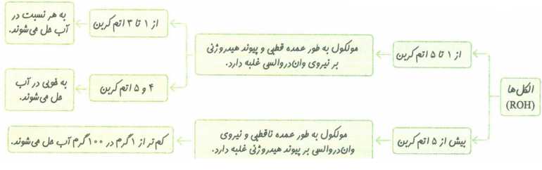 1- آلکان های راست زنجیر چون کاملا ناقطبی هستند در آب حل نمی شوند و الکل های تا 3 اتم کربن به هر نسبتی در آب حل می شوند.