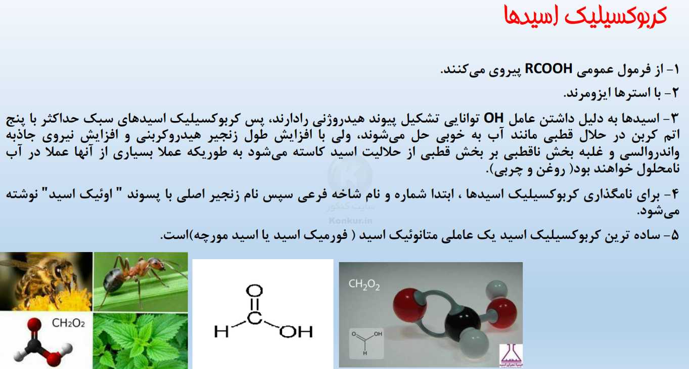 2- در کربوکسیلیک اسید ها نیز مانند، الکل ها، با افزایش طول زنجیر کربنی بخش ناقطبی بزرگتر می شود و قطبیت مولکول کاهش می یابد. در نتیجه انحلال پذیری آن ها در آب کمتر می شود.