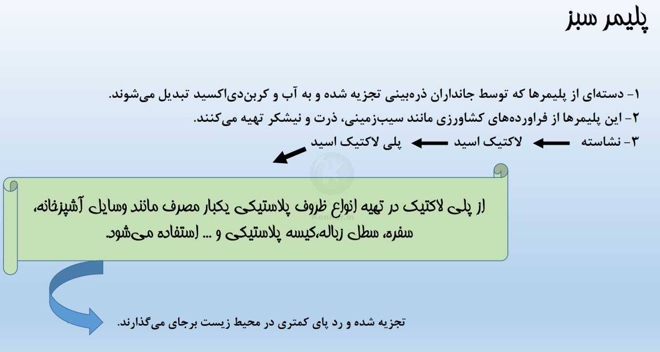 از پلی لاکتیک اسید انواع ظرف های پلاستیکی یکبار مصرف مانند وسایل آشپز خانه، سفره، سطل زباله، کیسه ی پلاستیکی و.... تولید می شوند و شیر ترش دارای لاکتیک اسید است.