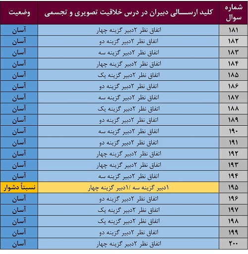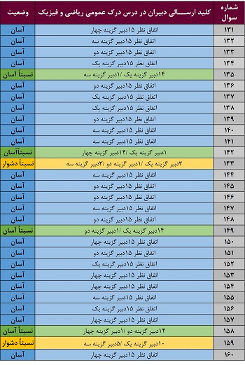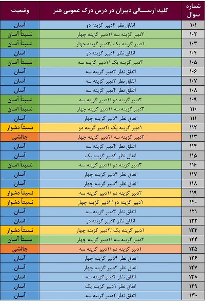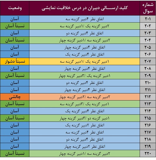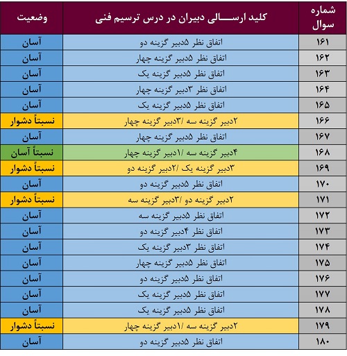 در 11 سوال بین یک تا سه دبیر گزینههای متفاوتی را نسبت به سایر دبیران انتخاب کردهاند . به نکته های این سوالات توجه کنید شاید برای شما هم دام دار باشند. در این خصوص با توجه به نسبت میزان پاسخدهندگان، 4 سؤال کمی دشوار به نظر میرسد. برای درک صحت این موضوع سؤالات 112، 119، 120 و 123 را یکبار به دقت بررسی نمایید.