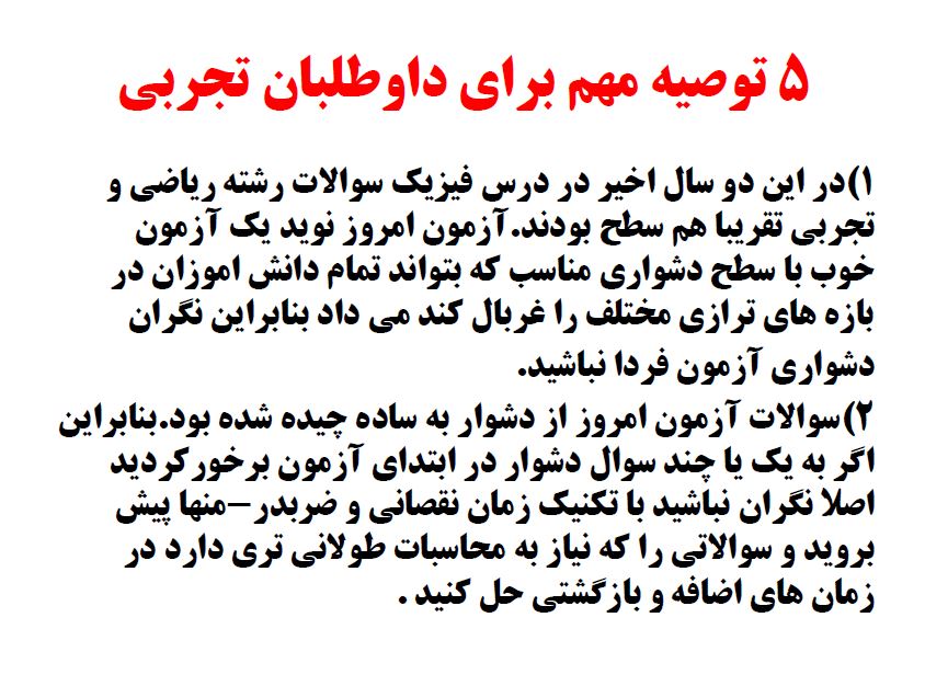 داوطلبان عزیز سلام تحلیل درس فیزیک آزمون امروز به همراه 5 توصیه مهم برای داوطلبان تجربی فردا را در ادامه مطلب مشاهده می کنید: