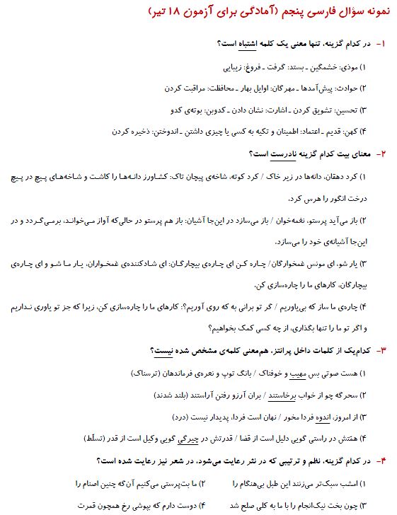 ششمی های عزیز سلامدر ادامه برای شما 20 سوال فارسی پنجم دبستان برای آمادگی آزمون 18 تیر به همراه پاسخ تشریحی آورده شده است. موفق باشید.فرزانه خاکپاش - گروه تولید آزمون