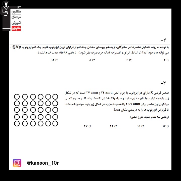 5 سوال شیمی که در ادامه قرار دادیم، از مبحث ایزوتوپ بوده و برای آمادگی بیشتر شما در آزمون ها توسط فاطمه احدزاده رتبه 373 رشته ریاضی سال 95 آماده و قرار داده شده است. بعد از مطالعه ی کتاب درسی، توصیه میکنم حتما این سوالات را حل کرده و جواب های خود را با پاسخنامه بررسی کنید.