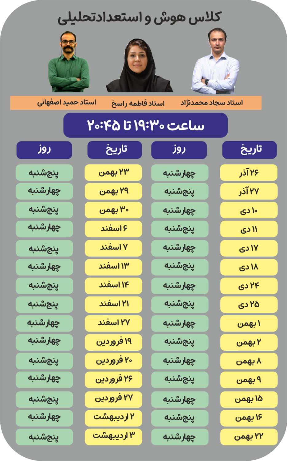 جدول برنامه دوره پاییز کلاسهای هوش و استعداد تحلیلی :
