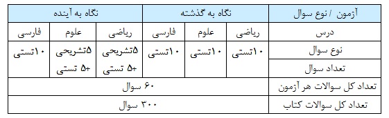 پس از پایان امتحانات پایان سال تا پایان تابستان تقریباً 16 هفته تعطیلی دارید. کتاب تابستان برای آمادگی آزمونهای تابستان شما از آزمون 6 مرداد در نظر گرفته شده است، یعنی برای تکمیل این کتاب به 10 هفته زمان نیاز دارید. با یک تقسیم ساده متوجّه میشوید که سهم هر هفته 30 سوال است!