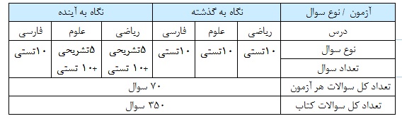 تعداد سوالات هر آزمون کتاب تابستان، درسها و چیدمان سوالات به صورت زیر است :