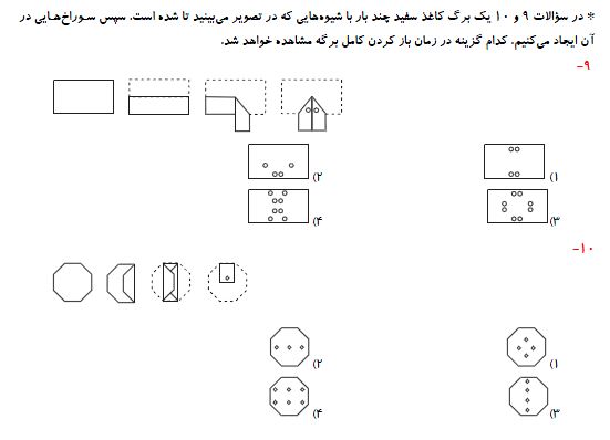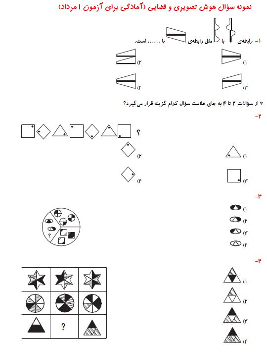 در ادامه برای شما 10 سوال هوش تصویری و فضایی برای آمادگی آزمون 1 مرداد آورده شده است. این سوالات را پاسخ دهید و سپس پاسخ خود را با فایل پی دی اف که بعد از سوالات برای شما قرار داده شده است مقایسه کنید.