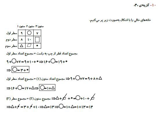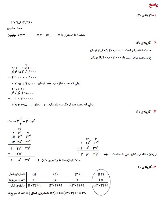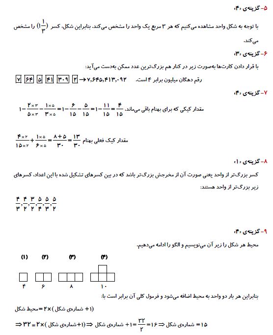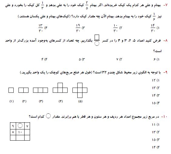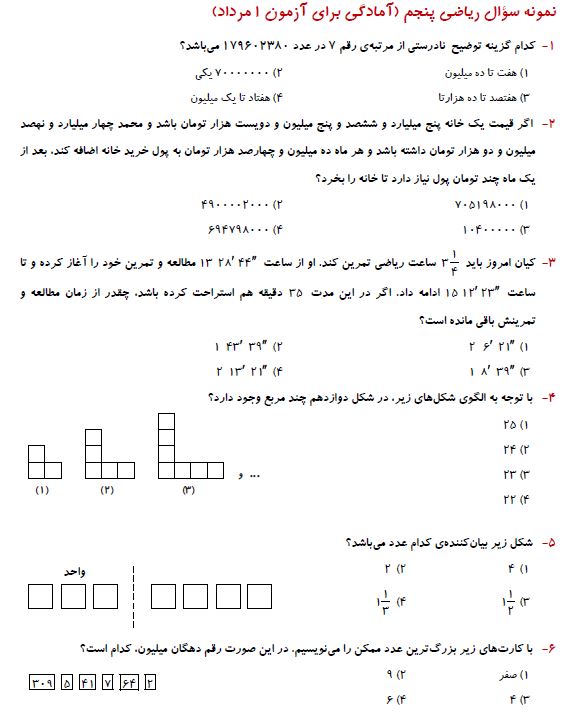 ششمی های عزیز سلامدر ادامه برای شما 10 سوال ریاضی پنجم برای آمادگی آزمون 1 مرداد به همراه پاسخ تشریحی آورده شده است. موفق باشید.فرزانه خاکپاش - گروه تولید آزمون
