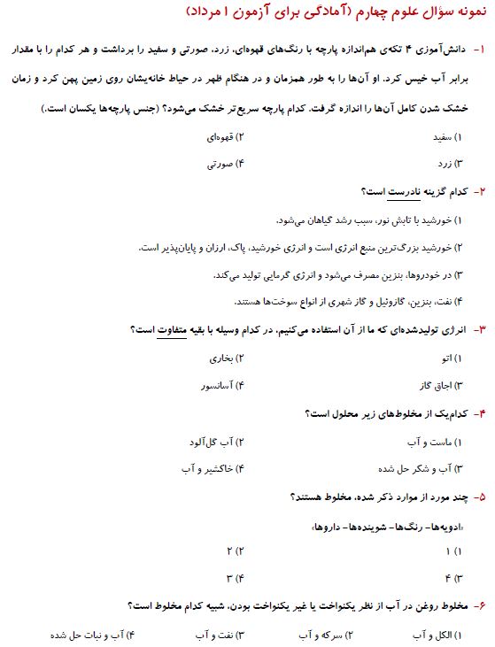 پنجمی های عزیز سلامدر ادامه برای شما 10 سوال علوم چهارم برای آمادگی آزمون 1 مرداد به همراه پاسخ تشریحی آورده شده است. موفق باشید.فرزانه خاکپاش - گروه تولید آزمون