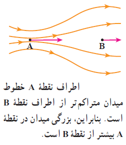 2) میزان تراکم خطوط میدان در هر نقطه از فضا نشان دهنده ی اندازه ی میدان در آن ناحیه است. هرجا خطوط میدان متراکم تر باشد، اندازه ی میدان بیشتر است.