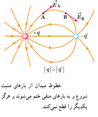 3) در آرایشی از بارها خطوط میدان الکتریکی از بارهای مثبت شروع و به بار های منفی ختم می شوند. (این جوری یاد بگیرید که بارهای مثبت چشمه های خطوط و بارهای منفی چاه های خطوط میدان هستند.)