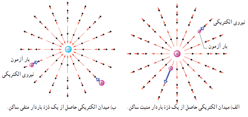 اگر یک بار آزمون را در نزدیکی یک ذره ی باردار مثبت یا منفی قرار دهیم، نیروی الکتریکی وارد بر بار آزمون در جهت دور شدن (برای بار مثبت) از ذره و یا در جهت نزدیک شدن (برای بار منفی ) به ذره خواهد بود.