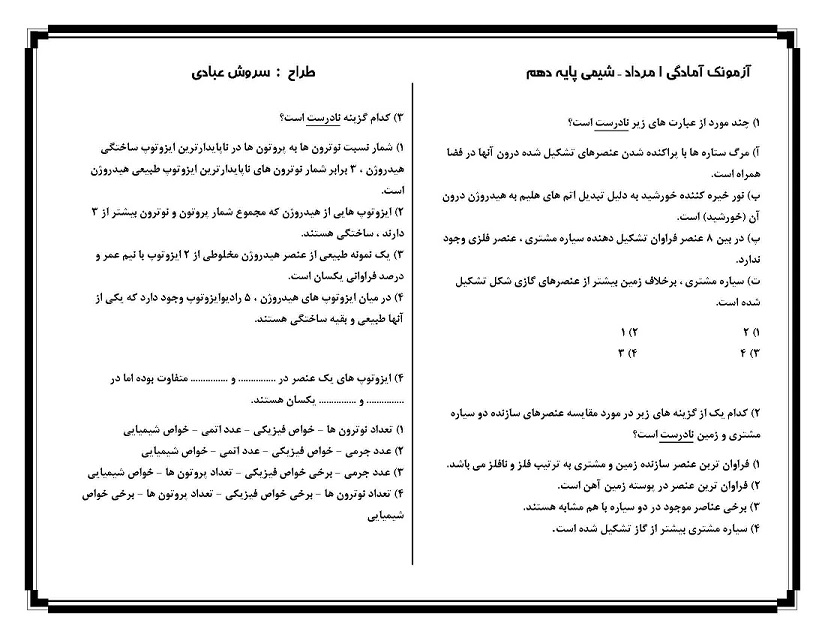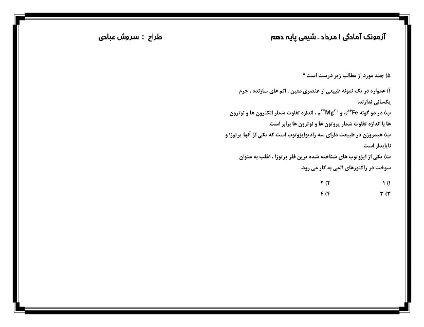 سلام به دانشآموزان عزیز آزمونکی که برای شما قرار داده شده یک آزمونک 5 سوالی از مباحث شیمی آزمون 1 مرداد یعنی فصل 1 تا پایان طبقهبندی عنصرهاست. با پاسخگویی به آن میزان تسلط خود را در این مبحث بیازمایید.
