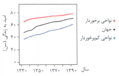 3- با توجه به نمودار روبرو، امید بهزندگیدر مناطق توسعه یافته و برخوردار بیشتر از مناطق کم برخوردار است.