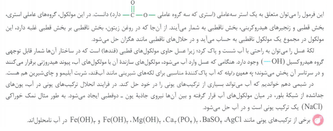در شیمی دهم خواندیم که طبق قاعده «شبيه،شبيه را حل می کند»، مواد قطبی درحلال های قطبی و مواد ناقطبی در حلال های ناقطبی حل می شوند. در فرایند انحلال، اگرذره های سازنده حل شونده با مولکول های حلال، جاذبه های مناسب برقرار کنند، حل شونده در حلال حلمی شود، در غیر این صورت ذره های حل شونده کنار هم باقی می مانند و در حلال پخش نمی شوند.