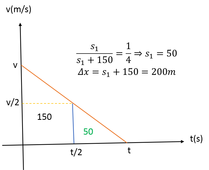 با کمک نمودار v-t و استفاده از قضیه تالس نسبت اضلاع مثلث کوچک به بزرگ 1 به 2 در نتیجه نسبت مساحتها 1 به 4 است.