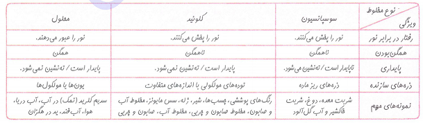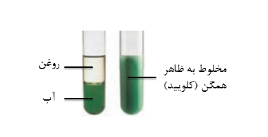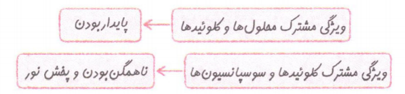 اغلب موادی که در زندگی روزانه با آنها سر و کار داریم، جزء مخلوط ها هستند. در شیمی دهم با مخلوط های همگن (محلولها) آشنا شدیم. همان طور که میدانید محلول ها (مانند محلول مس (II)سولفات درآب)، پایدارند و نور را عبور می دهند. حالا می خواهیم با دو دسته دیگر از مخلوط ها (کلوئیدهاو سوسپانسیون ها) آشنا شویم. کلوئیدها و سوسپانسیون ها جزء مخلوط های ناهمگن هستند. ذره های سازنده این مخلوط ها،درشت تر از محلول ها است، به همین دلیل برخلاف محلول ها نور را پخش می کنند. شکل رو به رو مقایسه رفتار نور در یک محلول و کلوئید را نشان می دهد. همان طور که می بینید کلوئیدبرخلاف محلول، مسیر عبور نور از میان کلوئیدها قابل دیدن است. ذره های سازنده کلوئیدها همانند محلول ها با گذشت زمان ته نشین نمی شوند؛ بنابراین می توان گفت کلوئیدها پایدار هستند. موادی مانند انواع رنگ ها و چسب ها، سرامیک ها، شیر، ژله وسس مایونز کلوئید هستند. اما سوسپانسیون ها (مانند شربت معده) ناپایدارند و باگذشت زمان، ذره های سازنده آنها ته نشین می شوند.