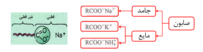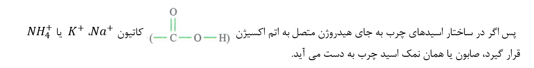 به نمک اسیدهای چرب، صابون می گویند. صابون های جامد، نمک سدیم اسید چرب و صابون های مایع، نمک پتاسیم یا آمونیم اسید چرب هستند؛